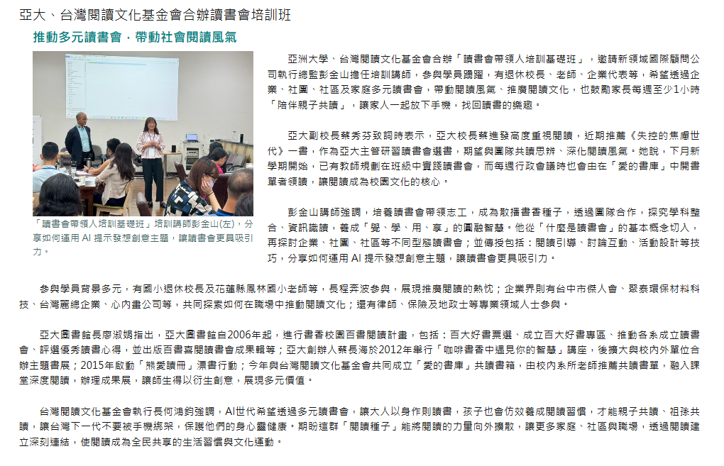 亞大、台灣閱讀文化基金會合辦讀書會培訓班