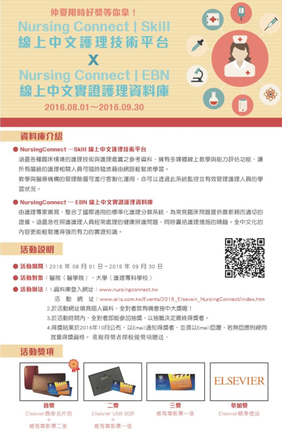 NursingConnect SKILL & EBN「仲夏限時好獎等你拿」有獎徵答活動開跑囉!! 2016-08-04 中文護理技術及實證資料庫開放試用,查找好用文獻還順便可以拿好獎! 即日起至9/30,一起來參加「仲夏限時好獎等你拿」有獎徵答活動~
